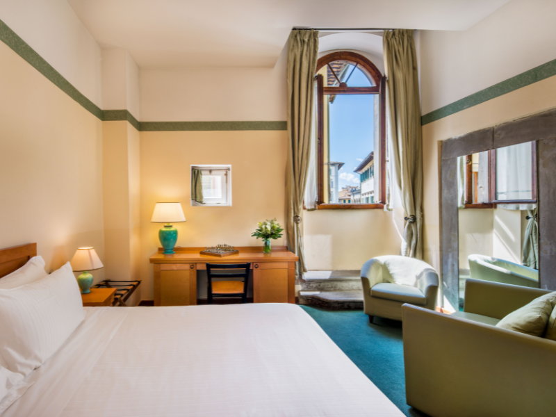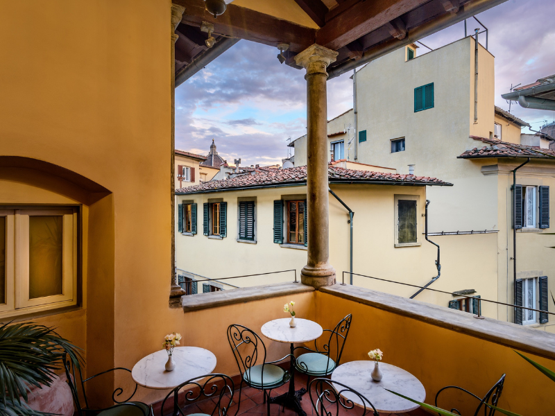 Ospitato in un palazzo cinquecentesco a pochi minuti dal Duomo e da Santa Maria Novella, l’hotel conserva tutto il fascino dell’architettura rinascimentale: soffitti affrescati, logge storiche, ambienti eleganti e camere decorate con opere d’arte. La terrazza panoramica sui tetti di Firenze è il luogo ideale per un momento di relax al tramonto, mentre le camere – incluse alcune Suite Spa – offrono un’atmosfera intima e raffinata, perfetta per una fuga romantica.